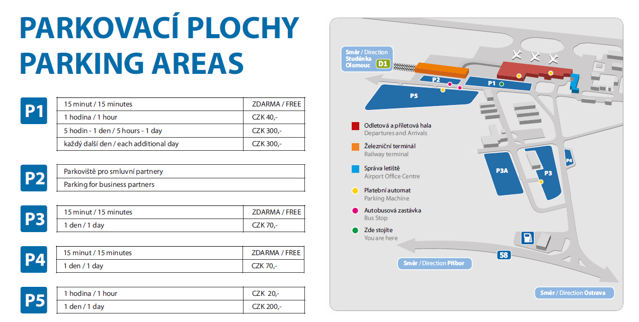 Pro pohodlné parkování můžete využít nové parkoviště P5 před železničním terminálem, vedle odletové haly. Parkoviště je vybaveno také místy pro dobíjení elektromobilů. Nejlevnější parkování je k dispozici na parkovišti P3, P3A a P4. Svůj vůz můžete zaparkovat také přímo před odletovou halu na parkovišti P1.